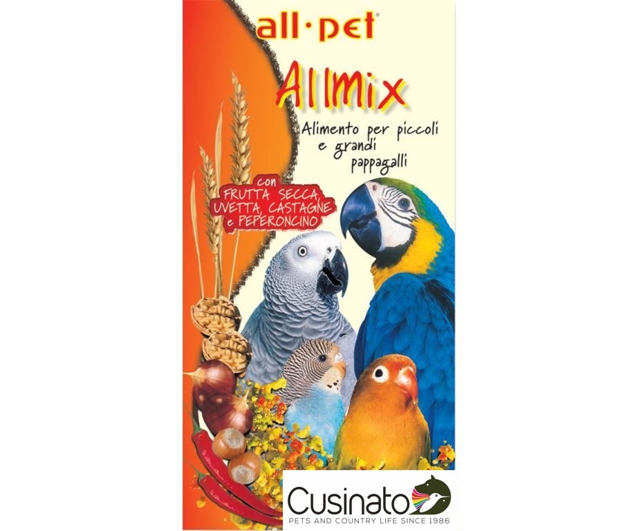 Alimento composto per piccoli e grandi Pappagalli, arricchito con pezzetti di frutta secca, uvetta castagne e peperoncino.