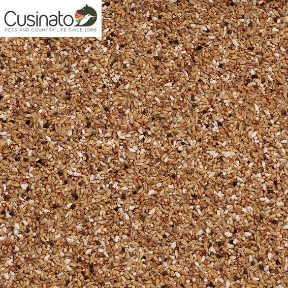 Orzo, frumento, sorgo rosso, dari, cartamo, riso integrale, grano saraceno, semi di canapa, miglio giallo, semi bianchi, semi di lino.