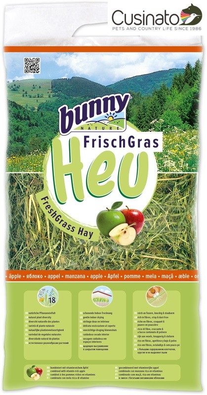 Bunny Fieno Fresco Mele è ricco di fibre, croccante ed a basso contenuto di polveri, con l’aggiunta di mela che porta ad un arricchimento di vitamine.