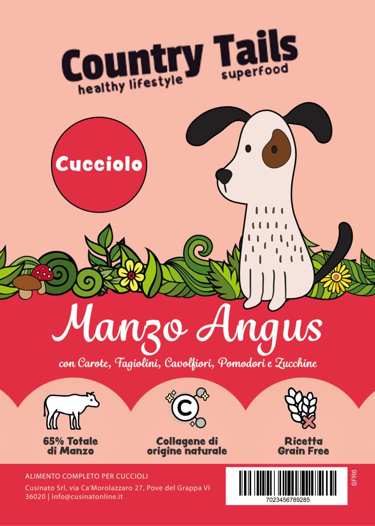 Country Tails Grain free per cuccioli a base di manzo angus con carote, fagiolini, cavolfiori, pomodori e zucchine
