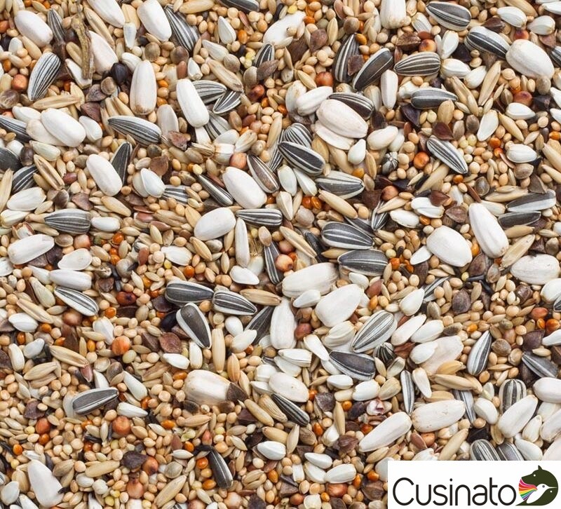 Scagliola extra 18% / Miglio giallo 23% / Miglio bianco 7% / Miglio rosso 5% / Niger 4% / Cardy 10% / Saraceno 5% / Canapa 4% / Girasole striato 7% / Girasole bianco 3% / Semi di lino 2% / Avena decorticata 2% / Avena 4% / Risone 2% / Dari rosso 4%