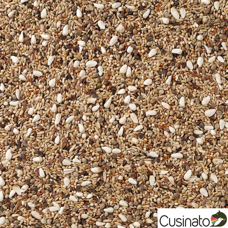 Scagliola extra 40% / Miglio giallo 12% / Miglio bianco 12% / Miglio rosso 6% / Niger 4% / Cardy 8% / Saraceno 4% / Canapa 6% / Semi di lino 6% / Avena decorticata 2%