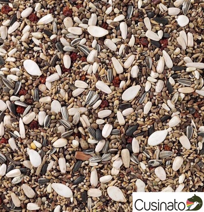 Scagliola extra / Ravizzone / Niger / Canapa / Cardy / Saraceno / Semi di lino / Avena decorticata / Perilla bianca / Miglio giallo / Cicoria / Cardo mariano / Semi di rosa canina / Girasole striato / Girasole nero / Girasole bianco / Pino d’Aleppo / Semi di zucca / Bacche di sorbo