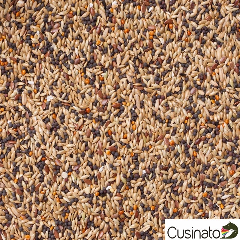 Scagliola extra 66,5% / Ravizzone 11,2% / Seme di colza 8% / Niger 1% / Canapa 0,4% / Grano saraceno 0,7% / Semi di lino 5,3% / Avena decorticata 3% / Miglio bianco 1,3% / Miglio rosso 1,3% / Panis rosso 1,3%