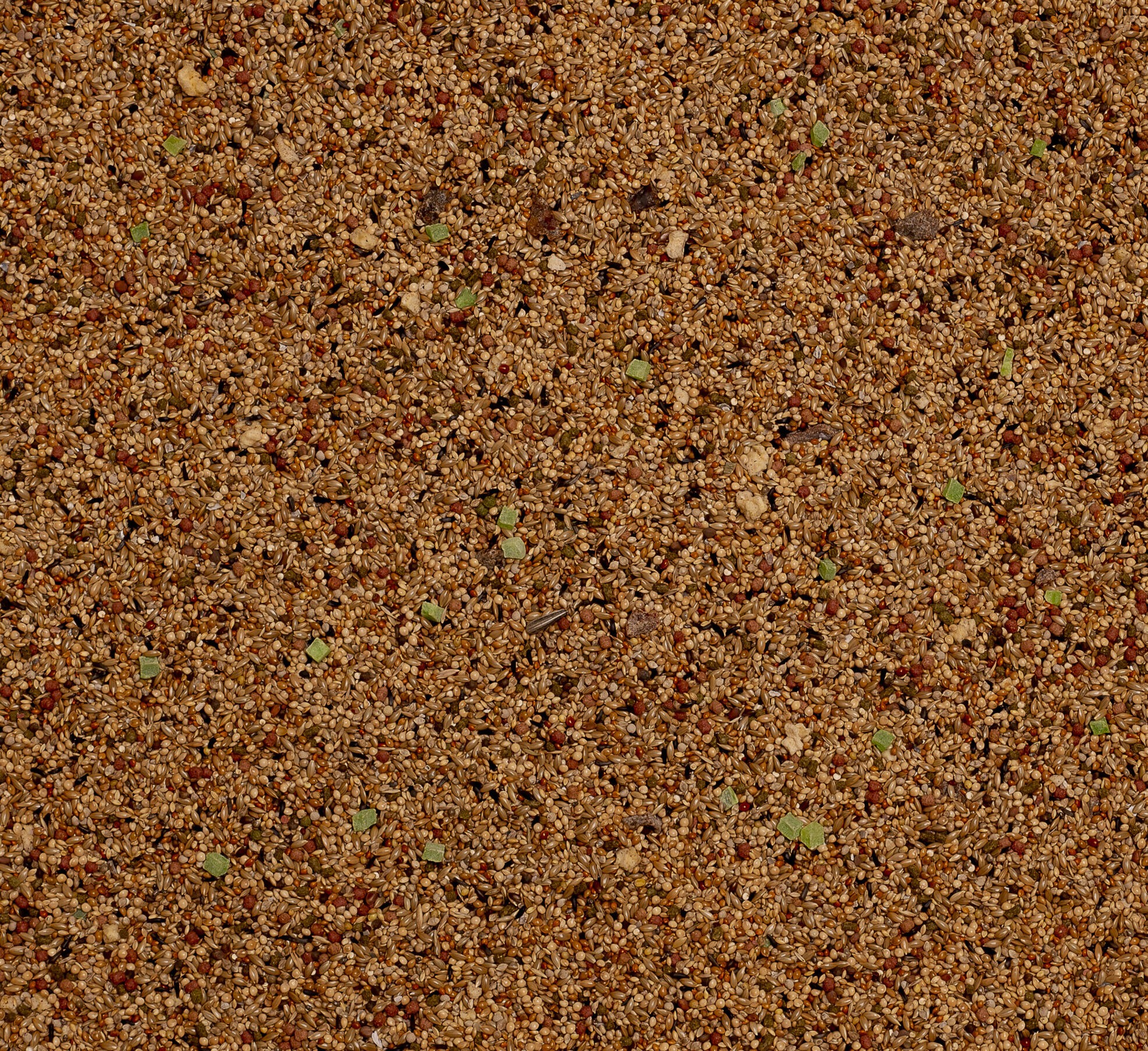 Cereali, semi (1% chia, 1% quinoa), sottoprodotti di origine vegetale, sostanze minerali (2,5% granaglie di uccelli), frutta (0,5% datteri essiccati, 0,5% kiwi essiccati, 0,5% mele essiccate), oli e grassi, ortaggi, lievito