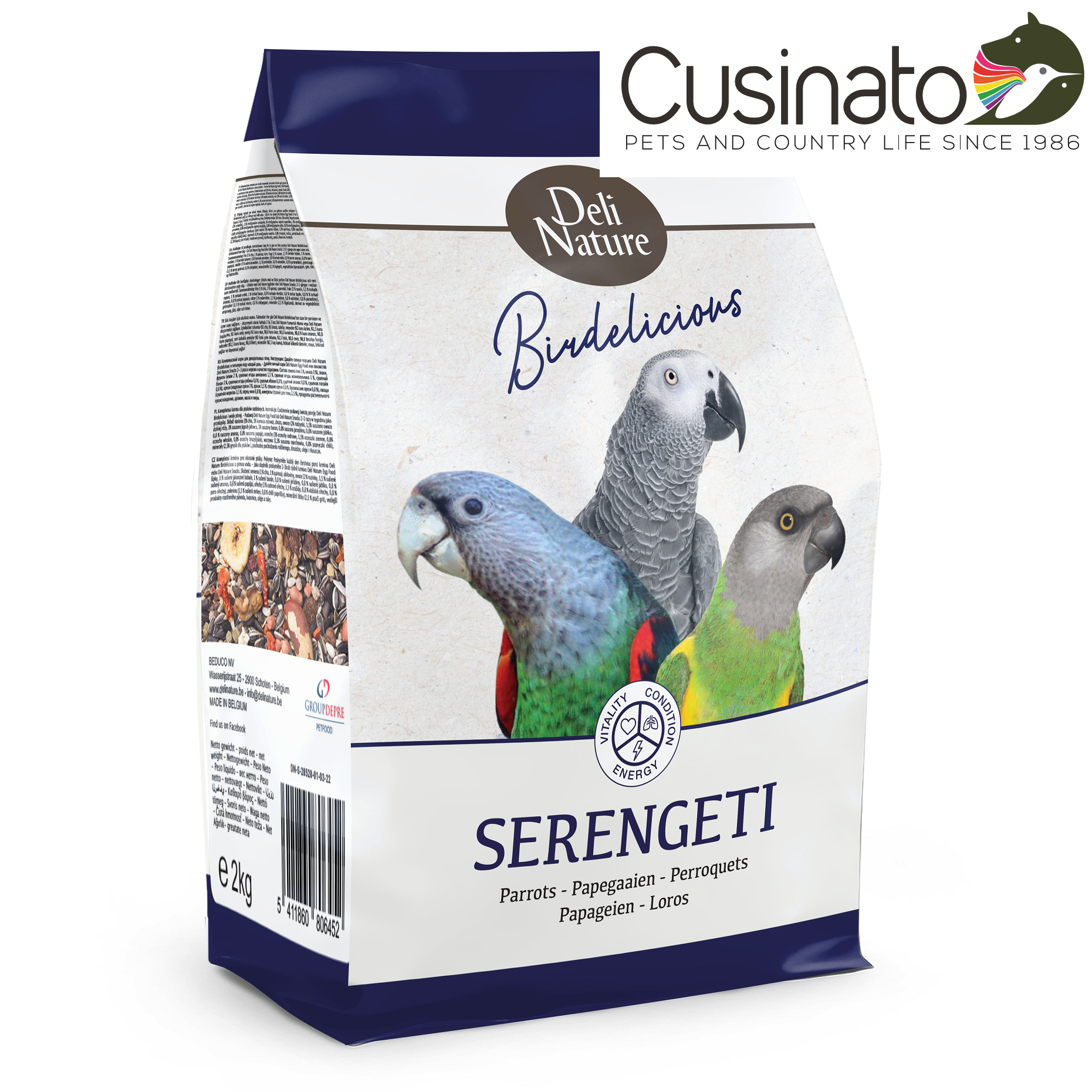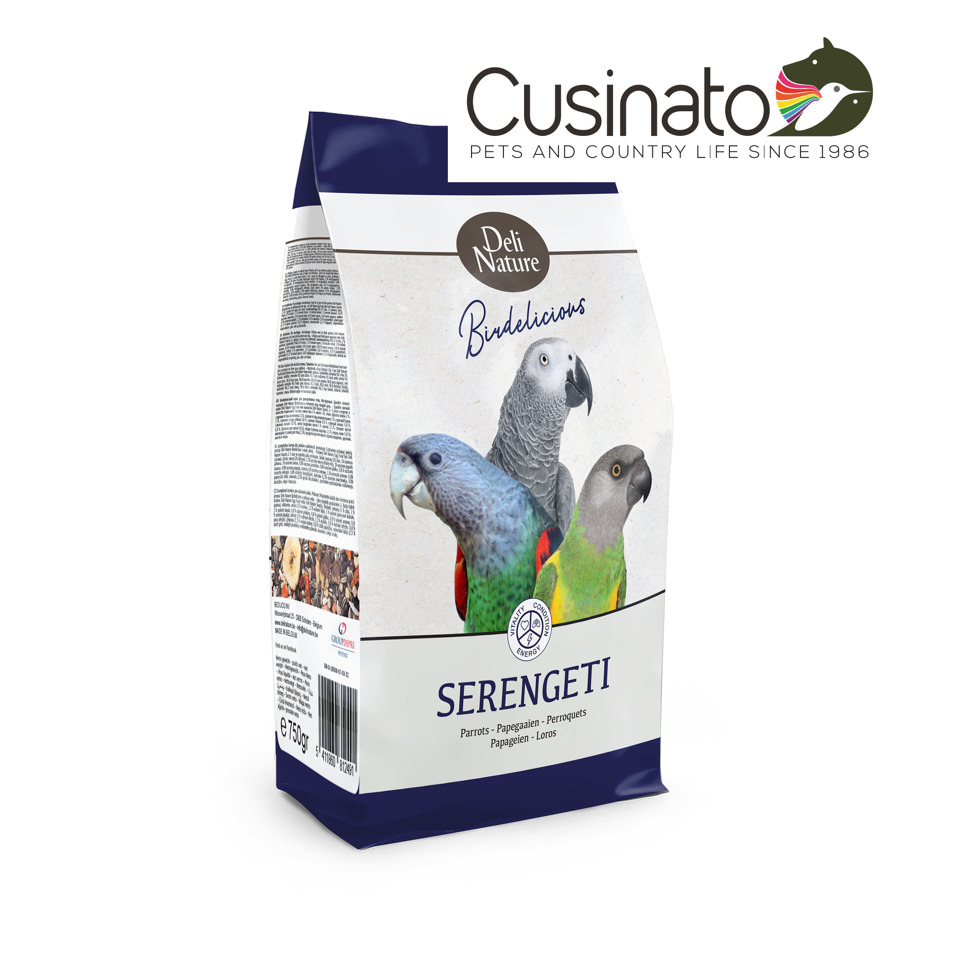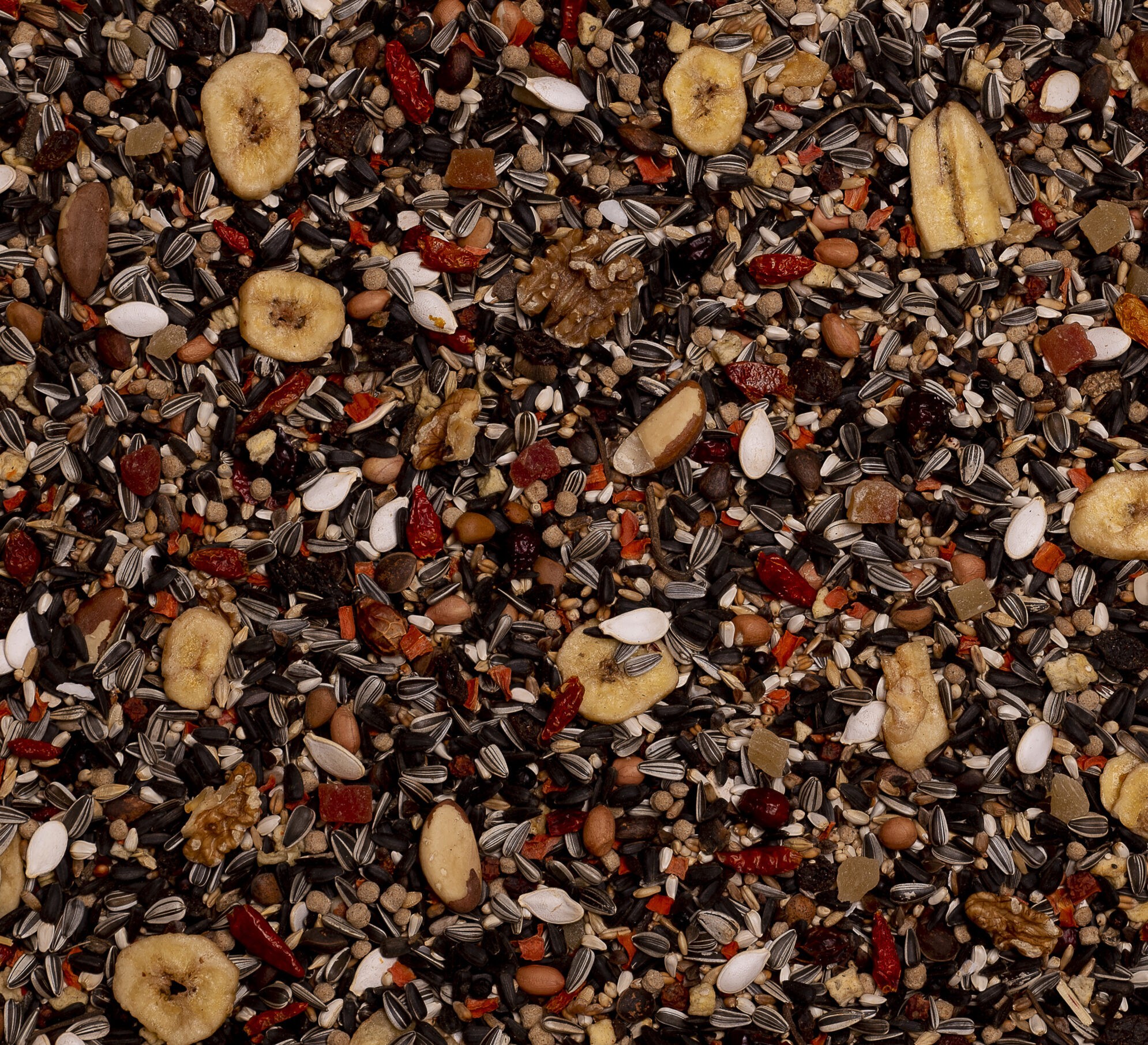 semi (1% chia, 1% quinoa), cereali, frutta (2% uvetta, 1,5% rosa canina essiccata, 1% bacche di ginepro essiccate, 1% banana essiccata, 0,8% bacche di sorbo essiccate, 0,8% mela essiccata, 0,8% essiccata ananas, 0,8% papaia essiccata), noci (3% noci di cedro, 1,5% arachidi, 0,8% noci, 0,8% noci del Brasile), verdure (1,5% carota essiccata, 0,8% peperoncino), minerali (2,5% semolato di uccelli), derivati di origine vegetale, lievito, oli e grassi