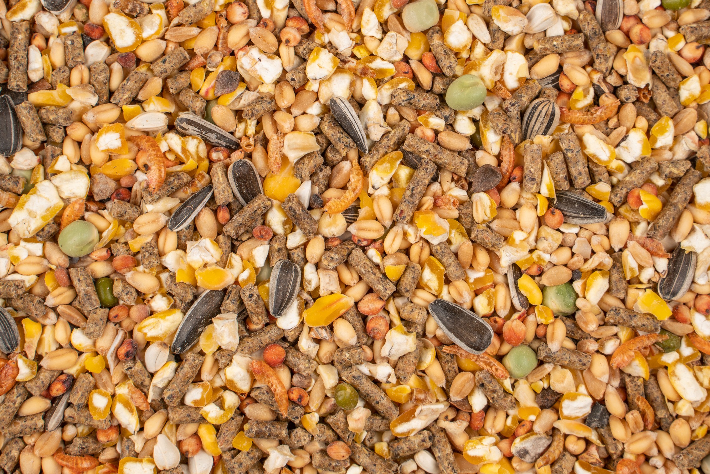 Maize, Wheat, soy (bean) feed, Sorghum, Calcareous marine shells, Sunflower seed feed, Small green peas, Oats peeled, Sunflower seed, Buckwheat, Spinach seed, Carrot seeds, Gammarus, Calcium carbonate, Mungbeans, Safflower seed, Radish seed, Lucerne, monocalcium phosphate, Soybean oil, Wheat gluten feed.