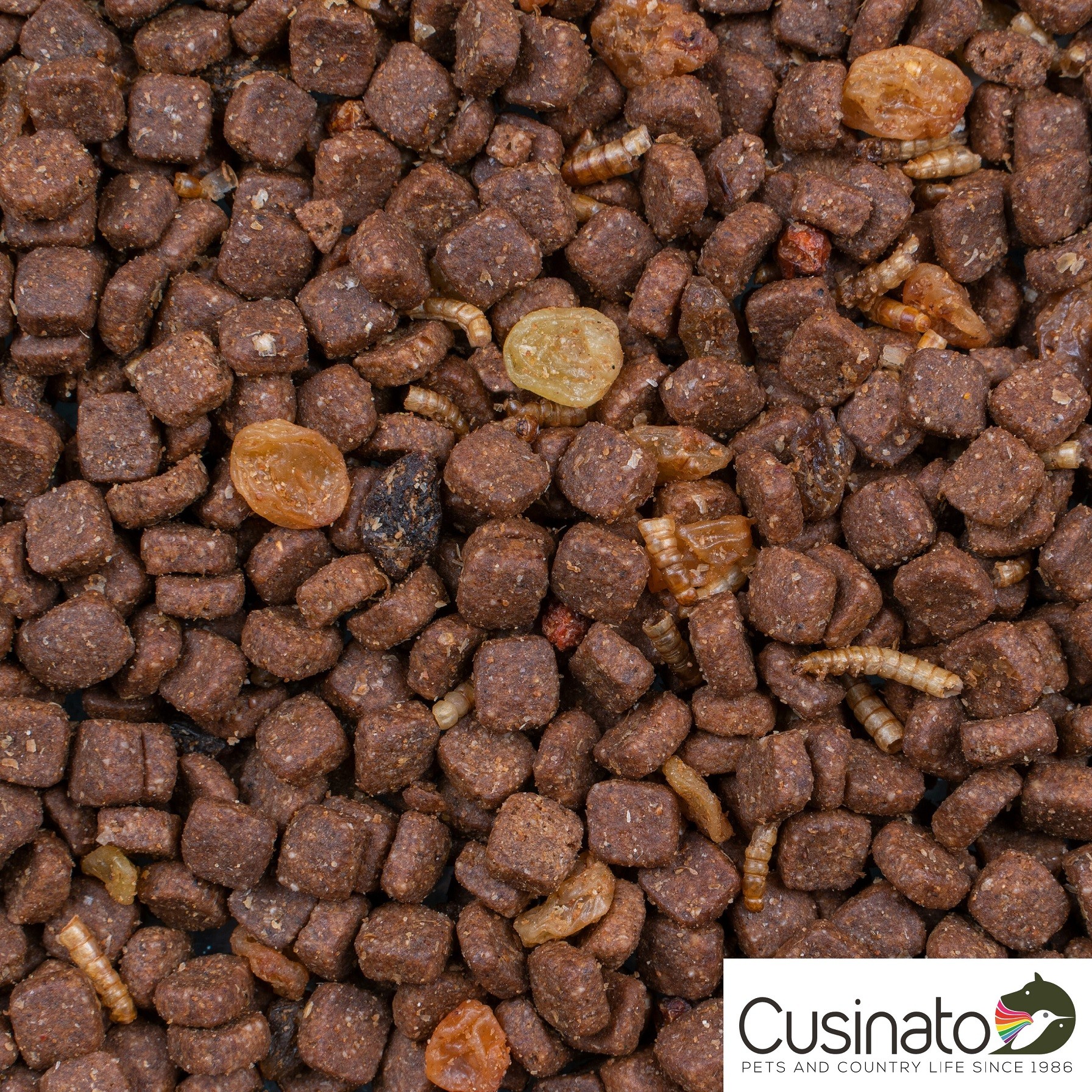 Con insetti (vermi della farina) e frutta (bacche di sorbo e uvetta).