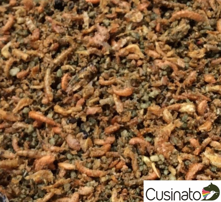 -L’elevata proporzione e grande varietà di insetti (ad es. Vermi secchi, grilli, gammarus, dafnia, ecc.) e l’aggiunta di miele naturale al 100% rendono questo alimento unico nel suo segmento.