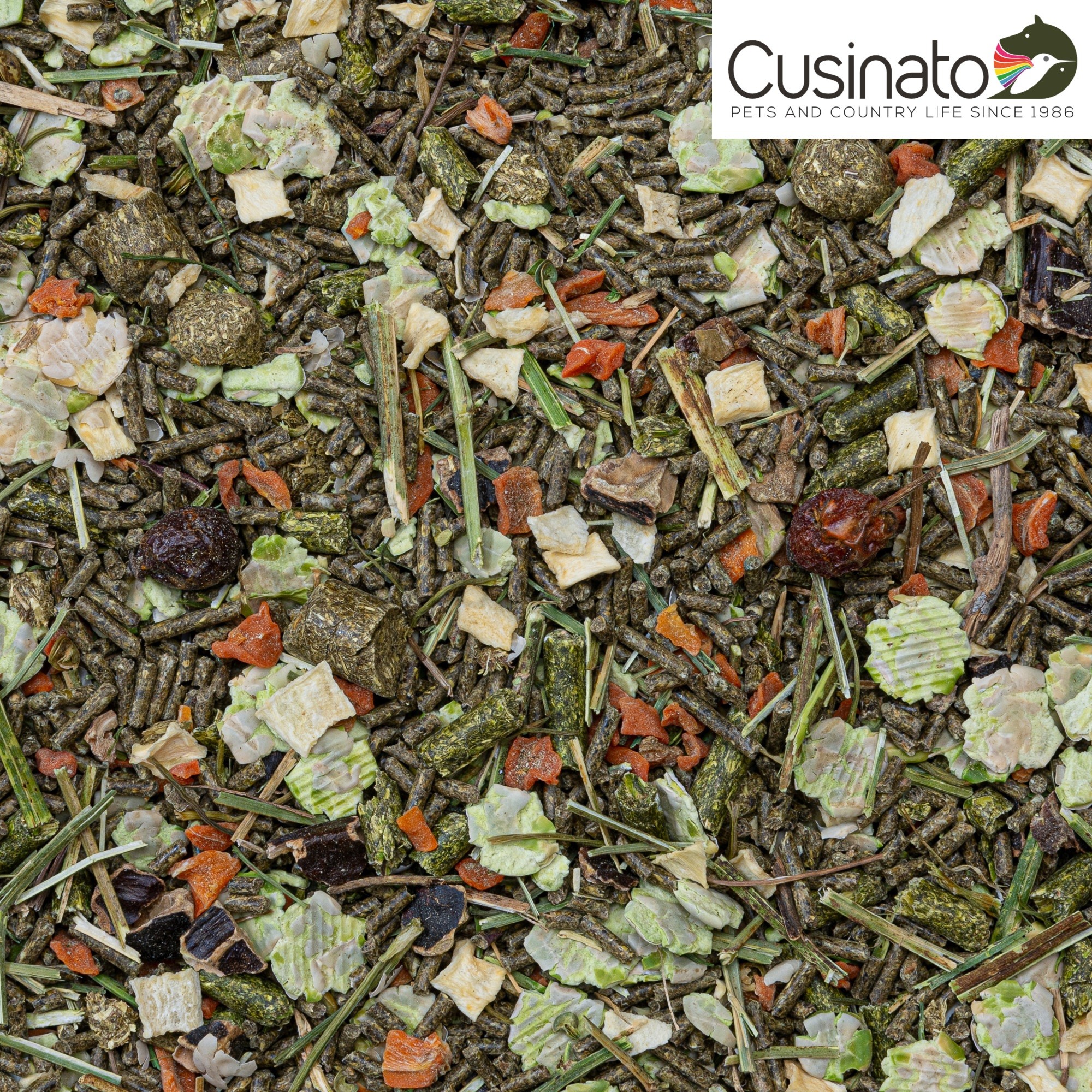 Derivati di origine vegetale (23% erba medica, 5% fieno di fleolo, 3% paglia di erba medica), verdure (3% carota essiccata, 2% pastinaca essiccata), minerali, frutta, oli e grassi.
