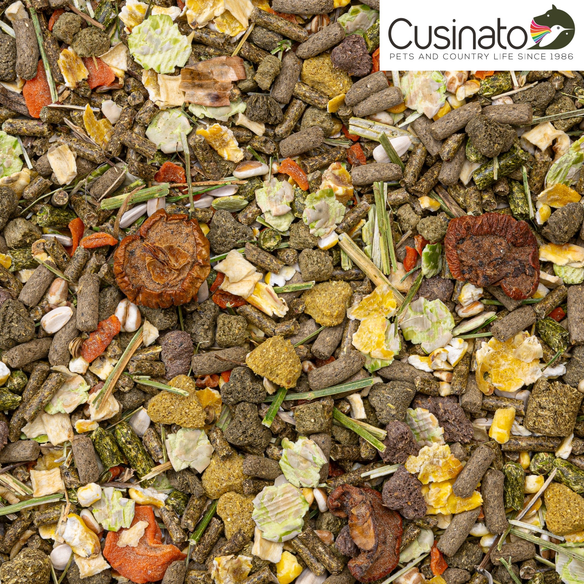 Erba medica (21%), fiocchi di piselli (10%), farina di semi di girasole, crusca di frumento, fieno di fleolo (6%), fiocchi di mais, bucce di avena, mela essiccata, paglia di erba medica (3%), farina di colza, fibre di piselli (2,6%), bucce di soia, amido di mais, mais estruso, mais soffiato, pastinaca essiccata (2%), carota essiccata (2%), mais, farina di soia, grano estruso, fieno, grano soffiato, semi di girasole, olio di semi di lino, carbonato di calcio, melassa di barbabietola (da zucchero), prezzemolo (0,4%), fosfato bicalcico, piantaggine (0,2%), orzo estruso, cloruro di sodio, olio di girasole, barbabietola essiccata (0,1%), ortica (0,05%), semi di lino, tarassaco (0,05%), echinacea (0,05%), camomilla (0,04%), foglie di fragola, curcuma (0,03%), origano (0,02%).