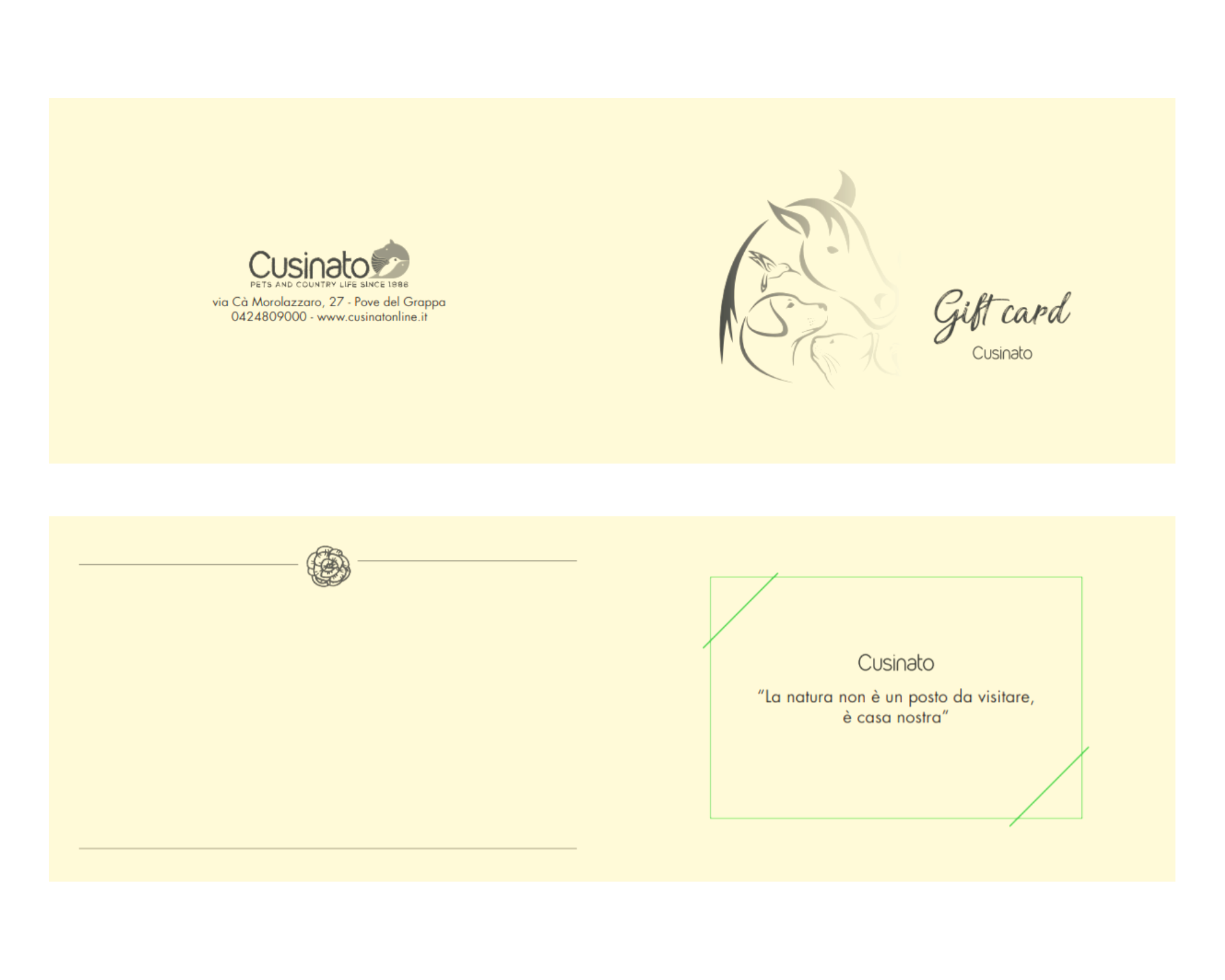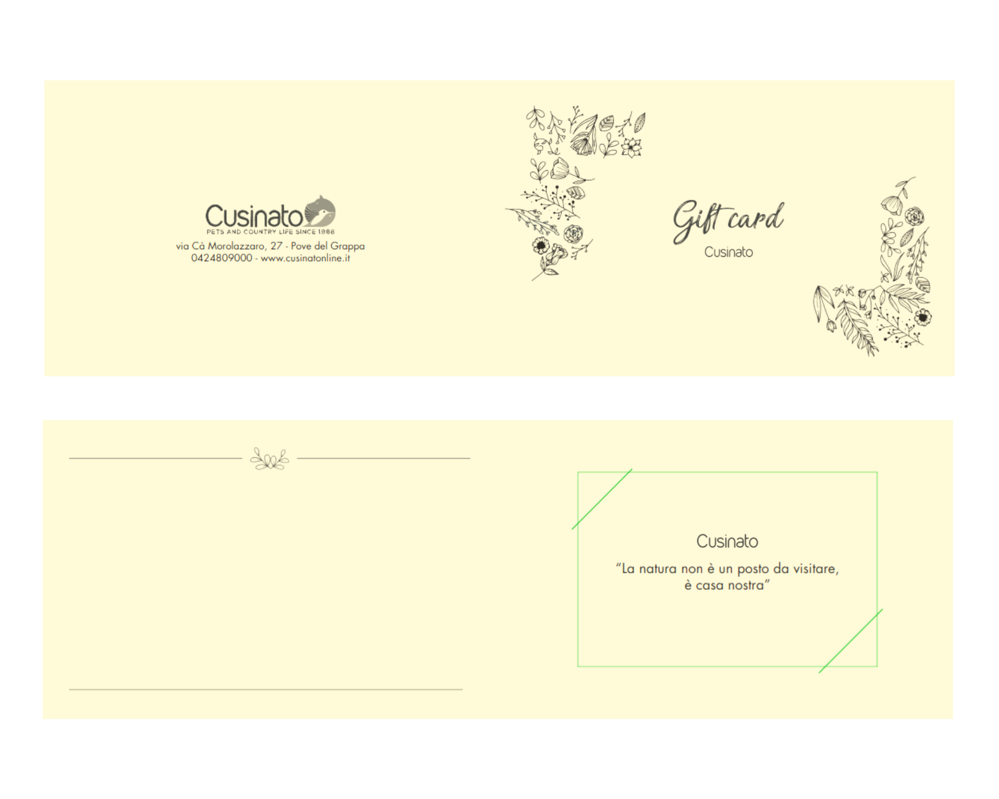 Gif Card-Digitale Ideale come regalo per amanti della Natura, Piante, Fiori ed Animali.Ne è possibile l’utilizzo a scalare o a saldo e possiede validità di un anno dalla data di acquisto. Il formato della gift card è digitale, può essere utilizzata tramite l’inserimento del codice (inviato per email) nell’apposito spazio del carrello acquisti. Invia direttamente il tuo regalo a chi vuoi! Zero Pensieri! Indicaci nello spazio apposito l’indirizzo email del destinatario della Gift Card, provvederemo noi a spedirla per te nella data scelta. (Viene garantito l’invio della mail nell’arco della giornata)È disponibile un campo di personalizzazione per un tuo messaggio dedicato.