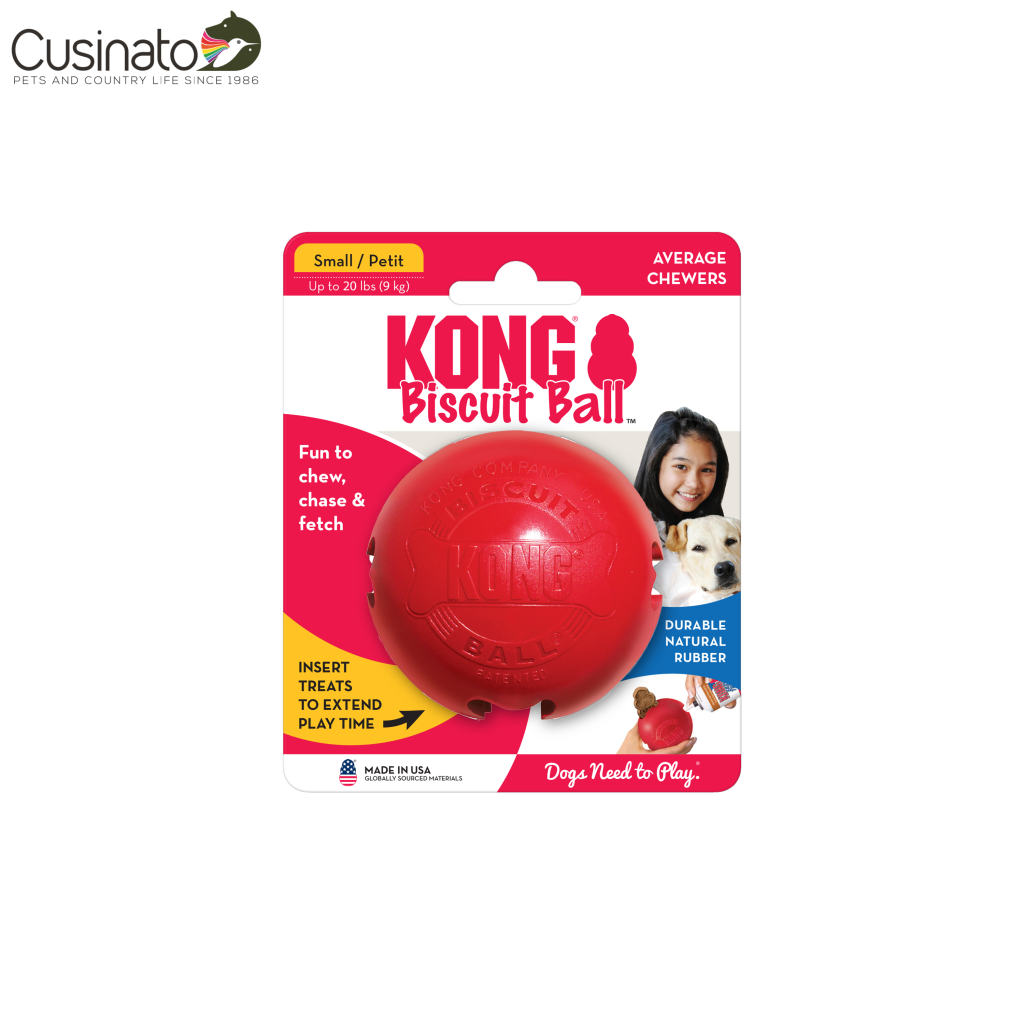 Il KONG Biscuit Ball™ è un originale giocattolo per cani che eroga cibo, con una cavità centrale e quattro fori a forma di osso da imbottire che possono contenere le crocchette o le ricompense preferite dal cane, è inoltre possibile congelarlo per prolungare la durata del divertimento.