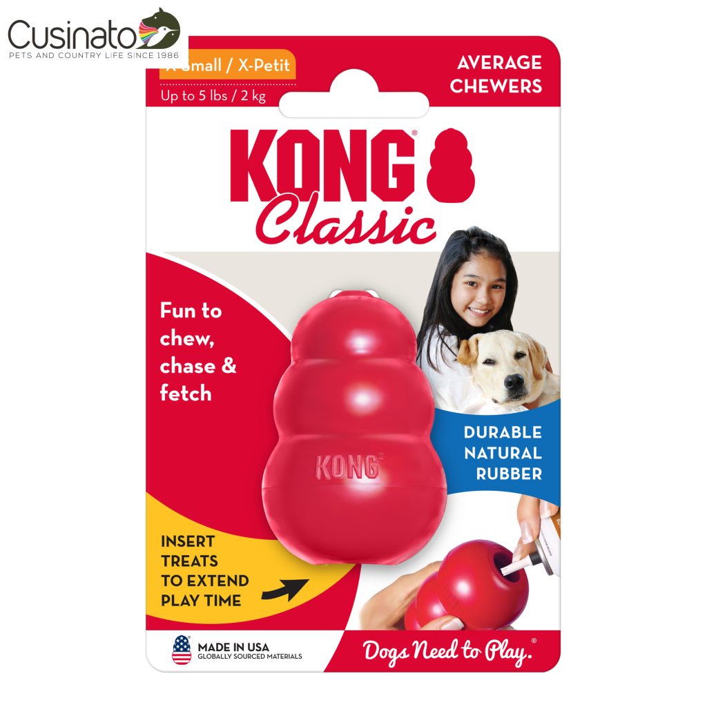 KONG Classic rappresenta l’eccellenza dei giochi ed un elemento fondamentale per i cani di tutto il mondo da oltre quarant’anni. Soddisfacendo in modo più ricco i bisogni istintivi sia dei cuccioli che degli adulti, l’esclusiva formula in gomma rossa completamente naturale KONG Classic è estremamente durevole e perfetta per i cani che amano masticare.