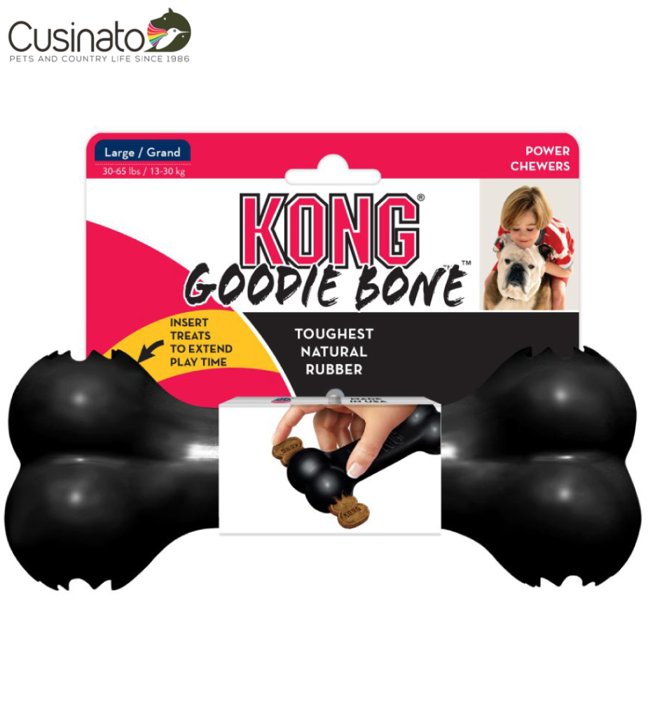 Il gioco KONG Extreme Goodie Bone™ soddisfa i masticatori più potenti a cui piace masticare molto. Realizzato con la più resistente ed esclusiva formula in gomma nera naturale KONG Extreme, questo osso è progettato per i masticatori più accaniti. In più, il KONG Extreme Goodie Bone™ dispone dei Goodie Grippers ™ brevettati che trasformano questo divertente gioco in una giocosa sfida che eroga golosità e possono essere riempiti con i croccantini preferiti dal cane, è inoltre possibile congelarlo per prolungare la durata del divertimento.
