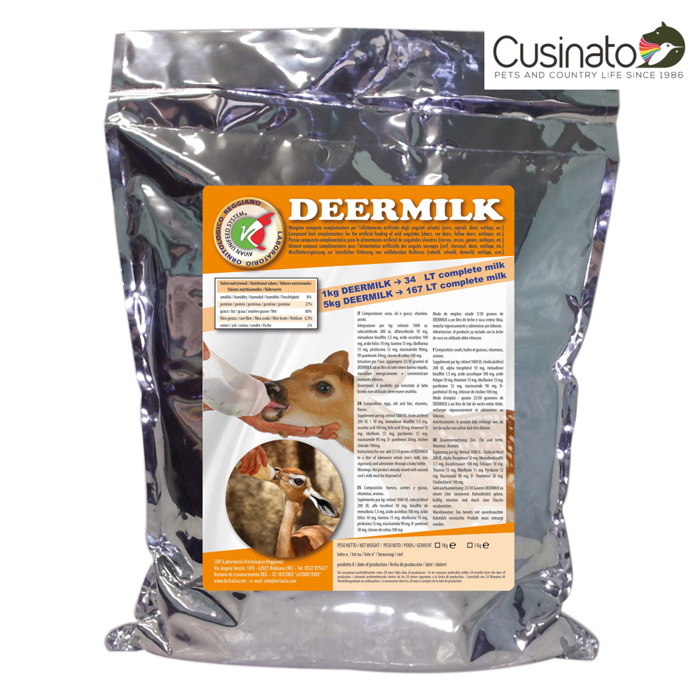 Aggiungere 25/30 grammi di deermilk ad un litro di latte intero bovino tiepido, mescolare energicamente e somministrare mediante biberon.