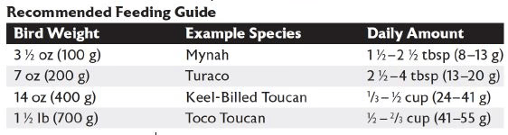 Le quantità di cibo sono linee guida e devono essere regolate in base alle condizioni fisiche dell’uccello, al livello di attività (volo libero o meno), allo stadio riproduttivo, ad altri alimenti offerti, alla struttura sociale e alle temperature ambientali.