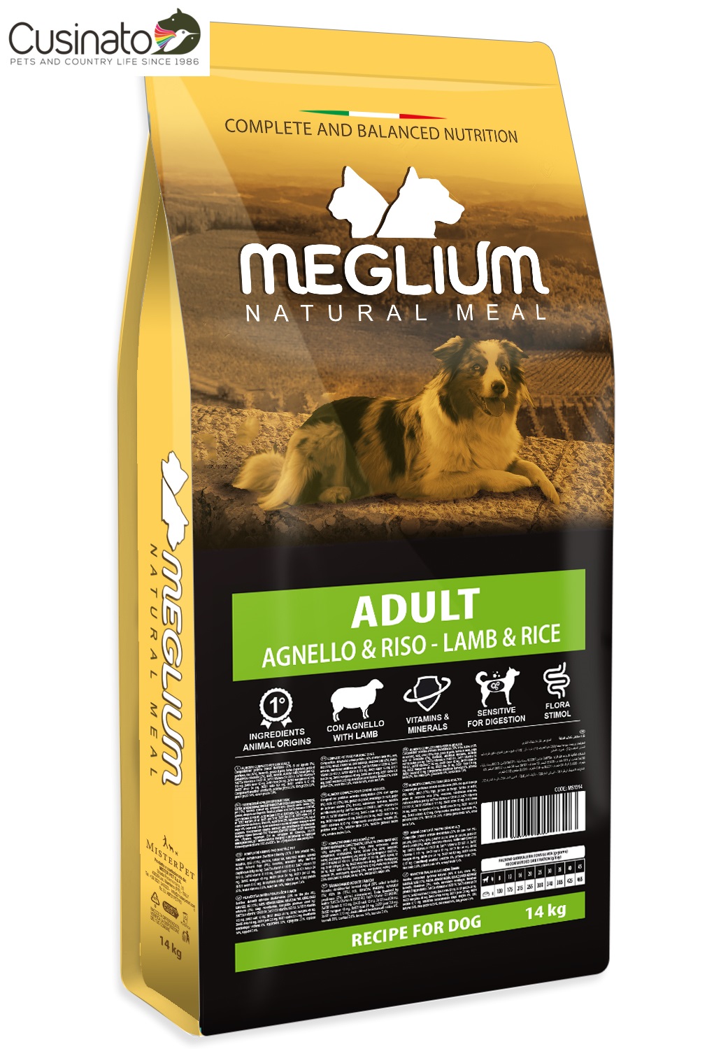 Ricetta appositamente sviluppata, la carne scelta proviene solo da agnelli selezionati, ed ha un elevato contenuto di proteine, tra il 30% ed il 40%, con un ottimo rapporto tra proteine e grassi, e tra vitamine e minerali.
