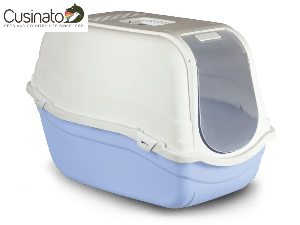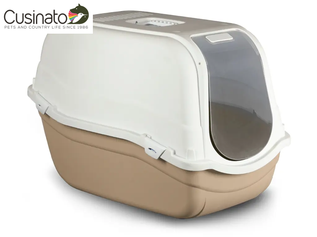 Lettiera per gatti confortevole e pratica, dotata di un ingresso con porta e filtro anti-odore al carbone attivo.