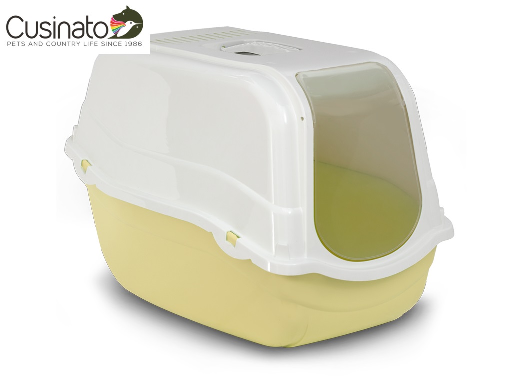 Lettiera per gatti confortevole e pratica, dotata di un ingresso con porta e filtro anti-odore al carbone attivo.