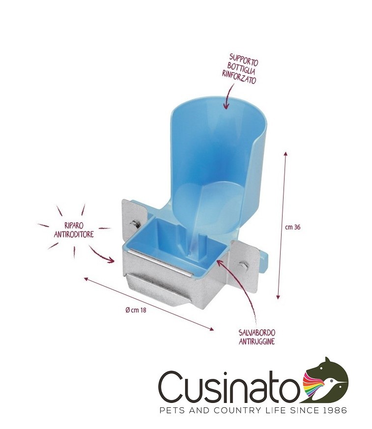 Abbeveratoio dotato di contenitore portabottiglia solido e resistente e salvabordo antiroditore. Adatto a tutti i tipi di rete
