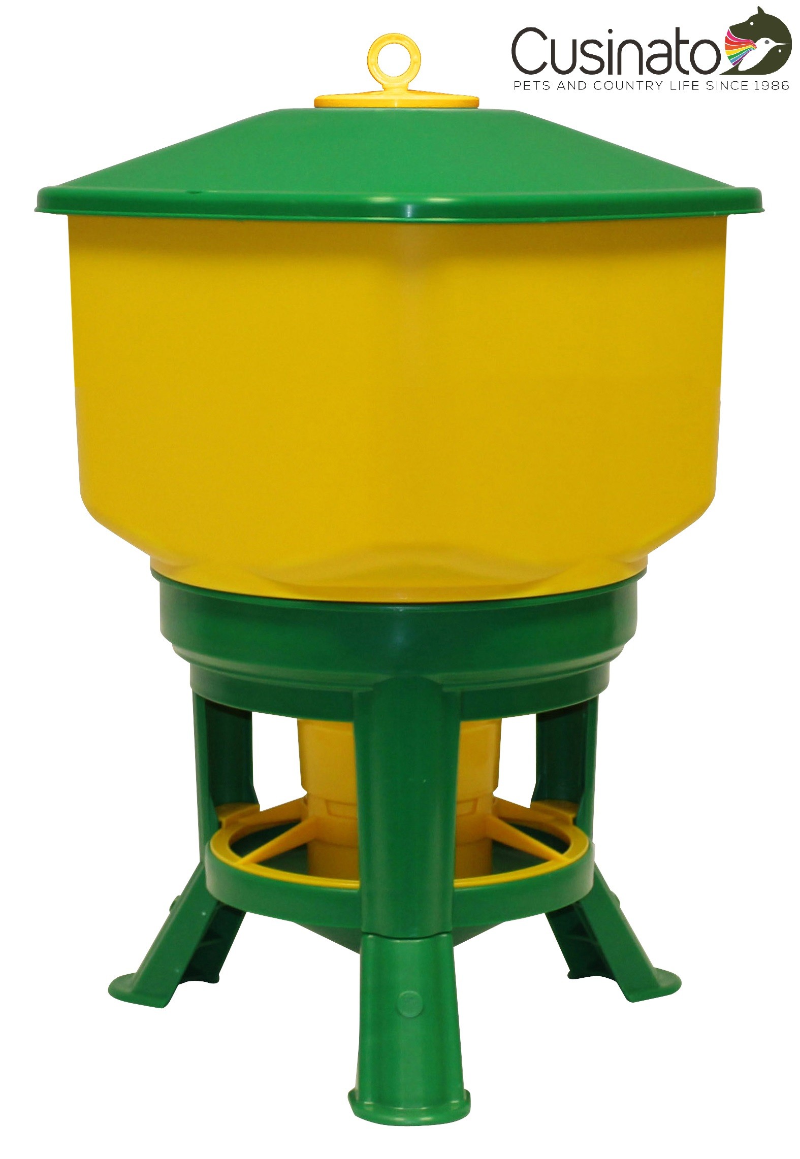 Mangiatoia per gallinacei di media e grossa taglia: impilabile, riempimento dall’alto, coperchio salvaimpurità.