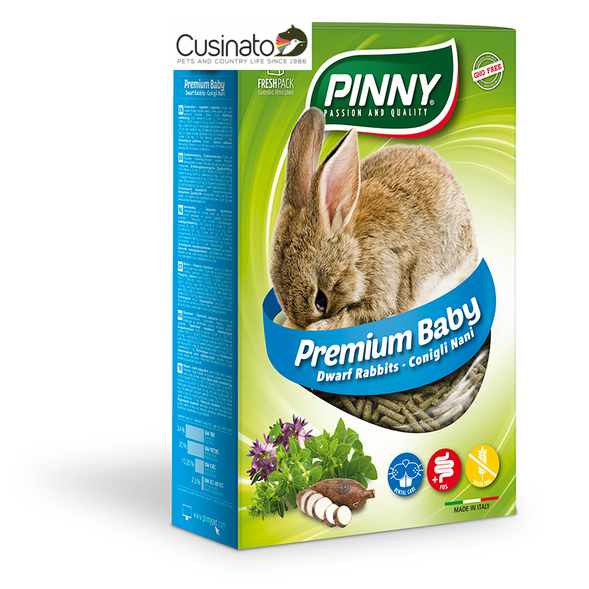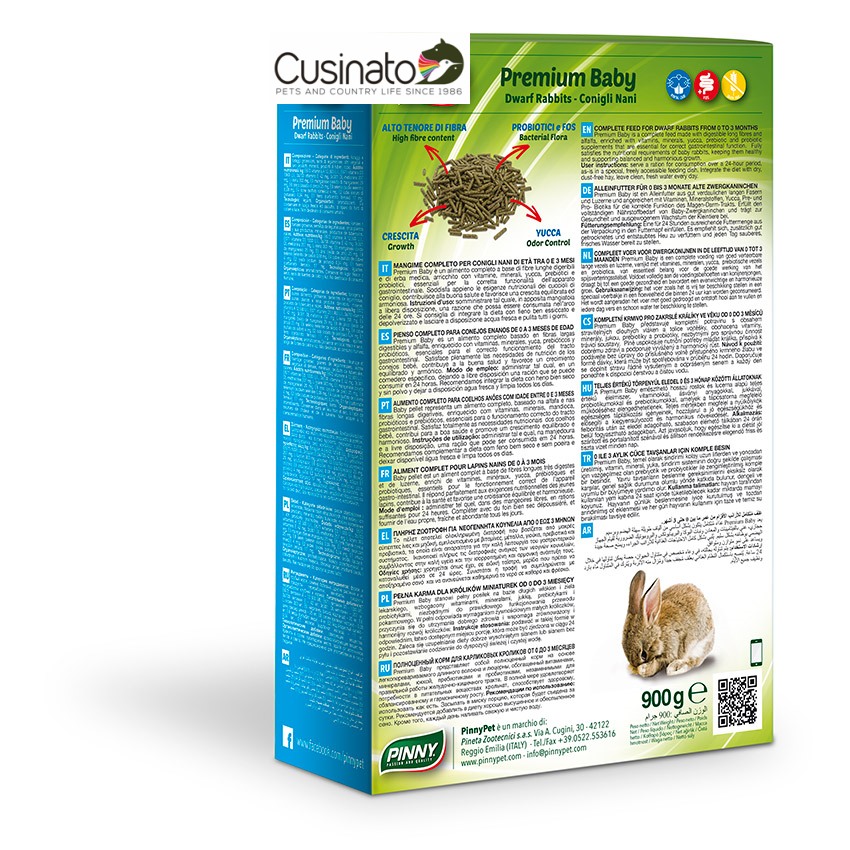 Premium Baby è un alimento completo a base di fibre lunghe digeribili e di erba medica, arricchito con vitamine, minerali, yucca, prebiotici e probiotici, essenziali per la corretta funzionalità dell’apparato gastrointestinale.