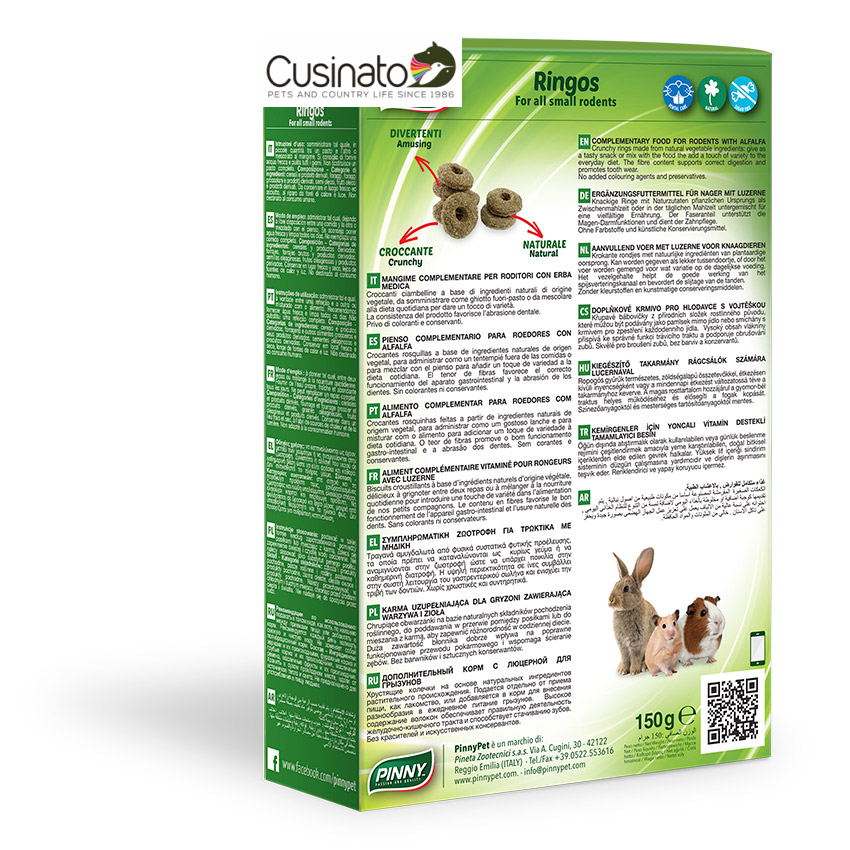 Croccanti ciambelline a base di ingredienti naturali di origine vegetale, da somministrare come ghiotto fuori-pasto o da mescolare alla dieta quotidiana per dare un tocco di varietà.