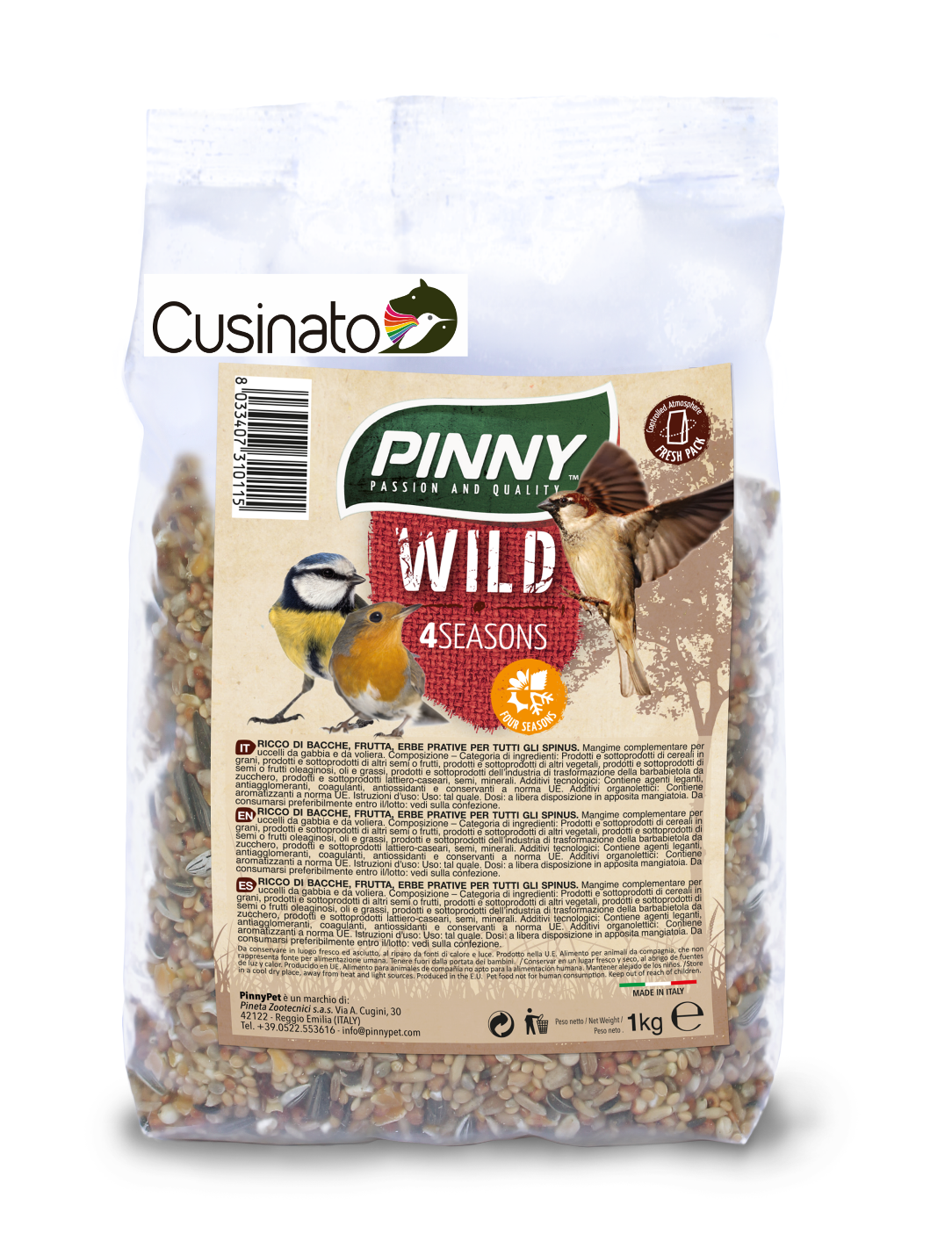 Miglio giallo, frumento, sorgo rosso, mais spezzato, girasole piccolo, miglio rosso, sorgo bianco, avena decorticata, girasole nero, niger, lino, frutta min. 6% (arachidi sgusciate, fichi disidratati e uvetta).