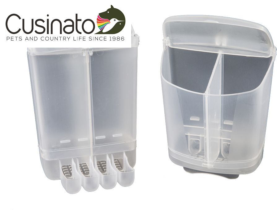 Mangiatoia a carica dall’alto a quattro diffusori per la corretta distribuzione dei germinanti, dotata di fori sul fondo e di divisorio per somministrare separatamente due differenti alimenti.
