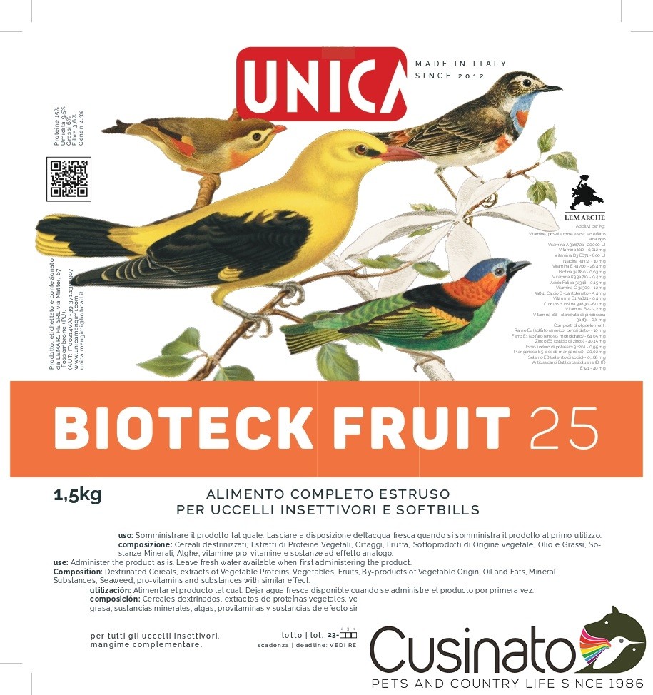 Ottimo Daily feed per tangare e softbills, le sue molecole sequestranti, un basso tenore di ferro e un indice proteico contenuto (16%) sono la chiave del perfetto bilanciamento di UNICA BioTech-Fruit-25.
