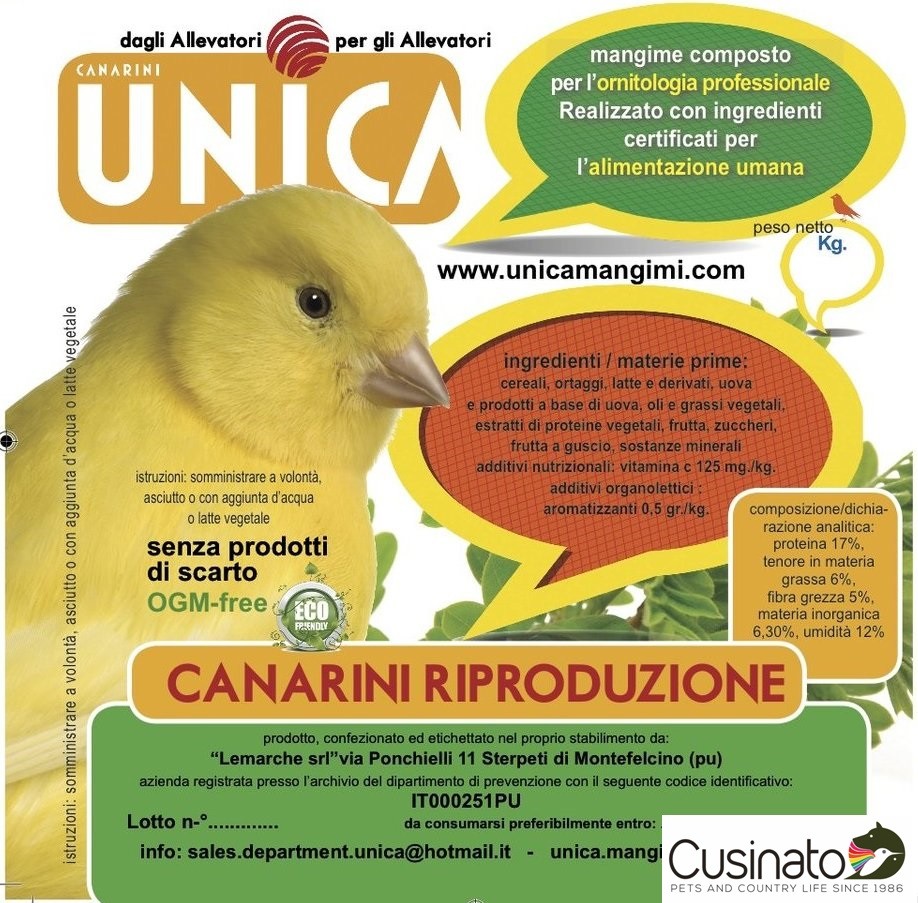 UNICA MANGIMI nasce dall’idea di un gruppo di amici allevatori ornitologici che mettendo in sinergia le proprie idee, competenze ed esperienze, puntando ad un altissimo standard qualitativo ed utilizzando solo materie prime selezionate e d’eccellenza, hanno dato vita al progetto UNICA. La gamma di prodotti comprende integratori e pigmentanti rigorosamente NATURALI, alimenti complementari sfarinati ed estrusi per uccelli granivori, frugivori ed insettivori.