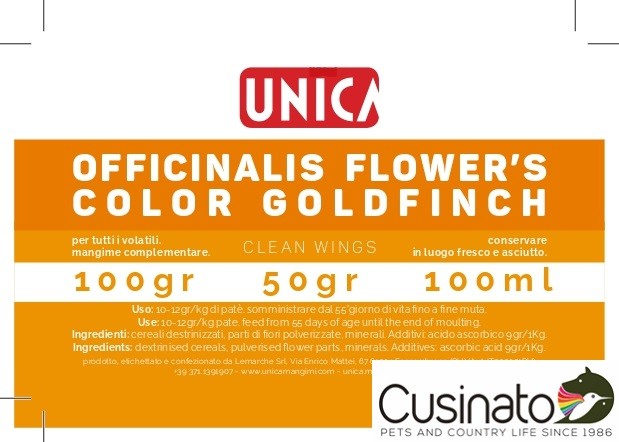Mix fiori polverizzati a freddo, pigmentante specifico per CARDELLINI È composto da una miscela di petali, pollini, stimmi e parti di fiori naturalmente ricchi di xantofille.