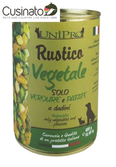 Unipro Rustico Vegetale è un mangime complementare per cani di tutte le taglie e razze. Le verdure sono presentate in una gustosa gelatina vegetale, perfetta per combinarle con altro cibo umido a base di carne o pesce.