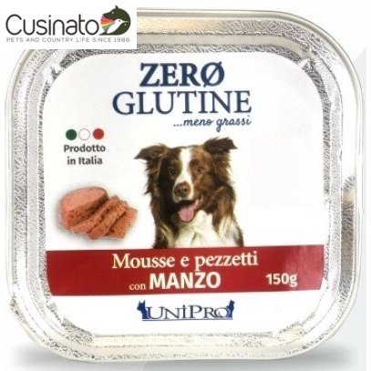Alimento umido per cani adulti o sterilizzati a base di manzo, senza glutine, di alta qualità e prodotto completamente in Italia.