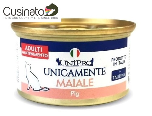 Alimento umido per gatti adulti di alta qualità, completamente prodotto in Italia, a base di maiale.
