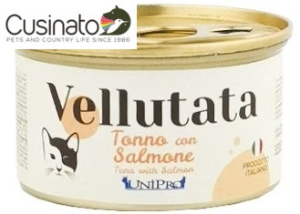 Alimento umido di alta qualità per gatti, completamente prodotto in Italia, a base di tonno e salmone.