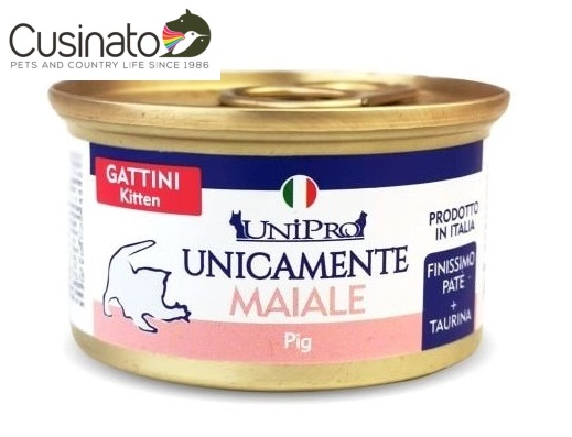 Alimento umido per gattini di alta qualità, completamente prodotto in Italia, a base di maiale.