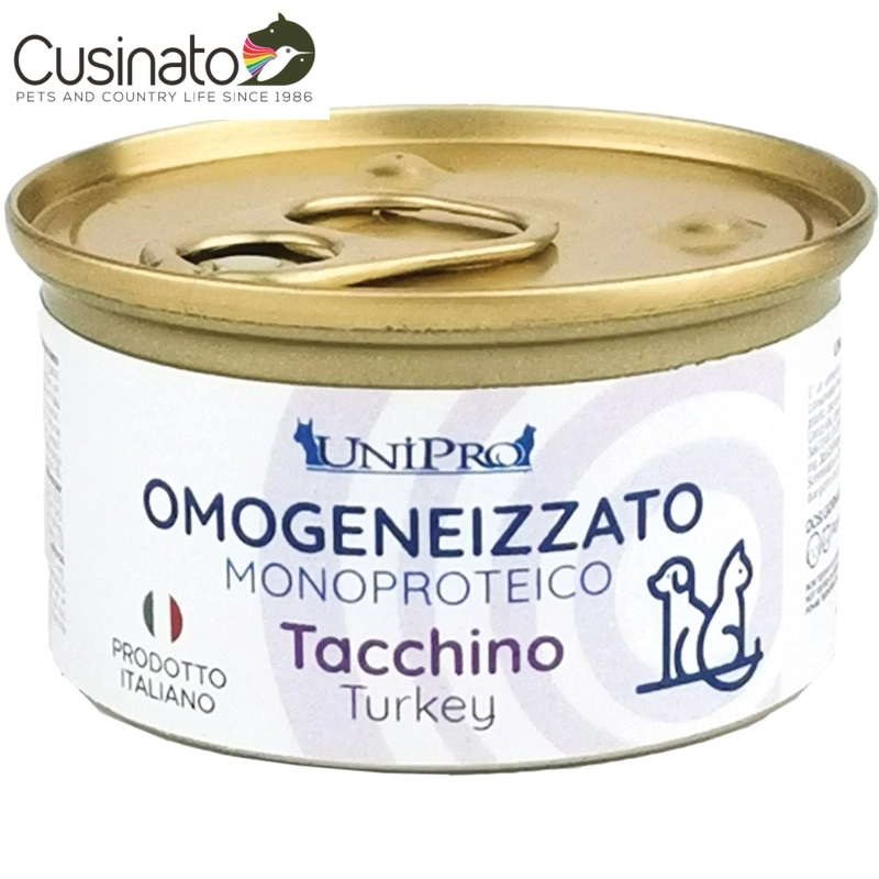 Alimento umido per cani e gatti a base di tacchino, monoproteico, di alta qualità e prodotto completamente in Italia.