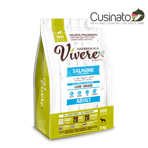 Medium Salmone Adult è realizzato utilizzando esclusivamente ingredienti etici 100% naturali con un basso contenuto di cereali; infatti l’unico cereale contenuto al loro interno è il riso integrale che, debitamente abbinato ai piselli, permette di regolarizzare e mantenere l’indice glicemico basso, a questo si aggiungono pesce fresco – per il 60% – e verdura frutta ed erbe officinali – per il restante 20%.