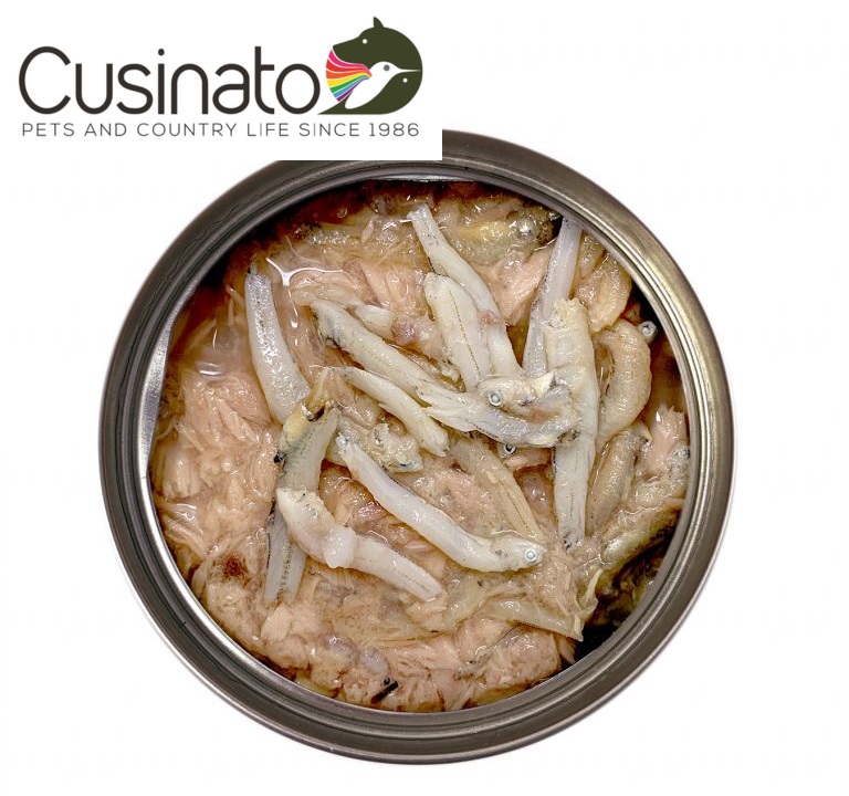 Alimento complementare per gatti adulti, in acqua, a base di Tonno e Pesciolini Bianchi, senza conservanti, coloranti e aromatizzanti.