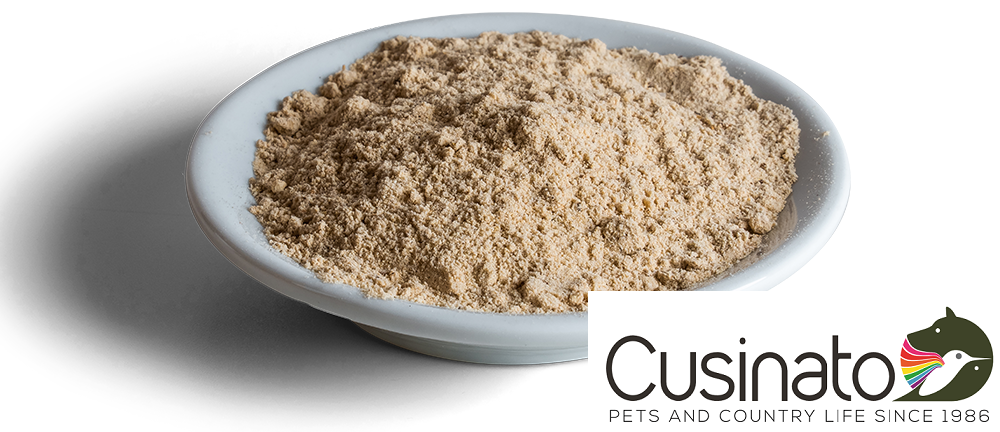 Granturco, semi di lino, proteina di soia, crusca di frumento, carbonato di calcio, plasma sanguigno, uova in polvere, fibra di mela, fosfato monocalcico, mash di cereali, lievito di birra, olio di colza, cloruro di sodio, gomma di carruba, lignocellulosa, Gamma Oryzanol.