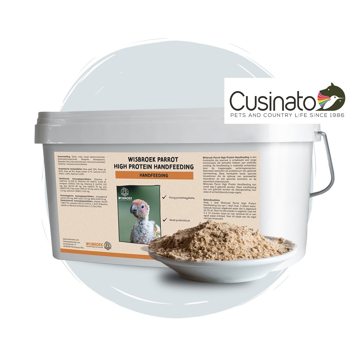 Wisbroek Parrot High Protein Handfeeding è un alimento naturale per l’allevamento ad alto contenuto energetico. È speciale e scientificamente sviluppato per nutrire i giovani pappagalli.